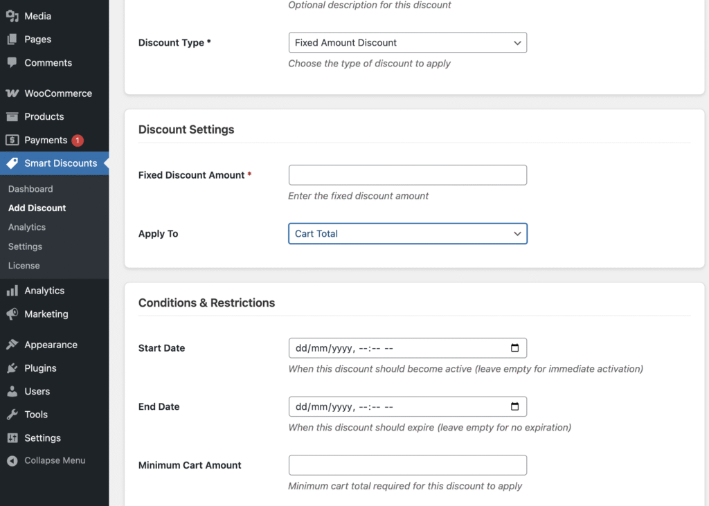 1. Discounts > Add Discount from your WordPress admin sidebar.