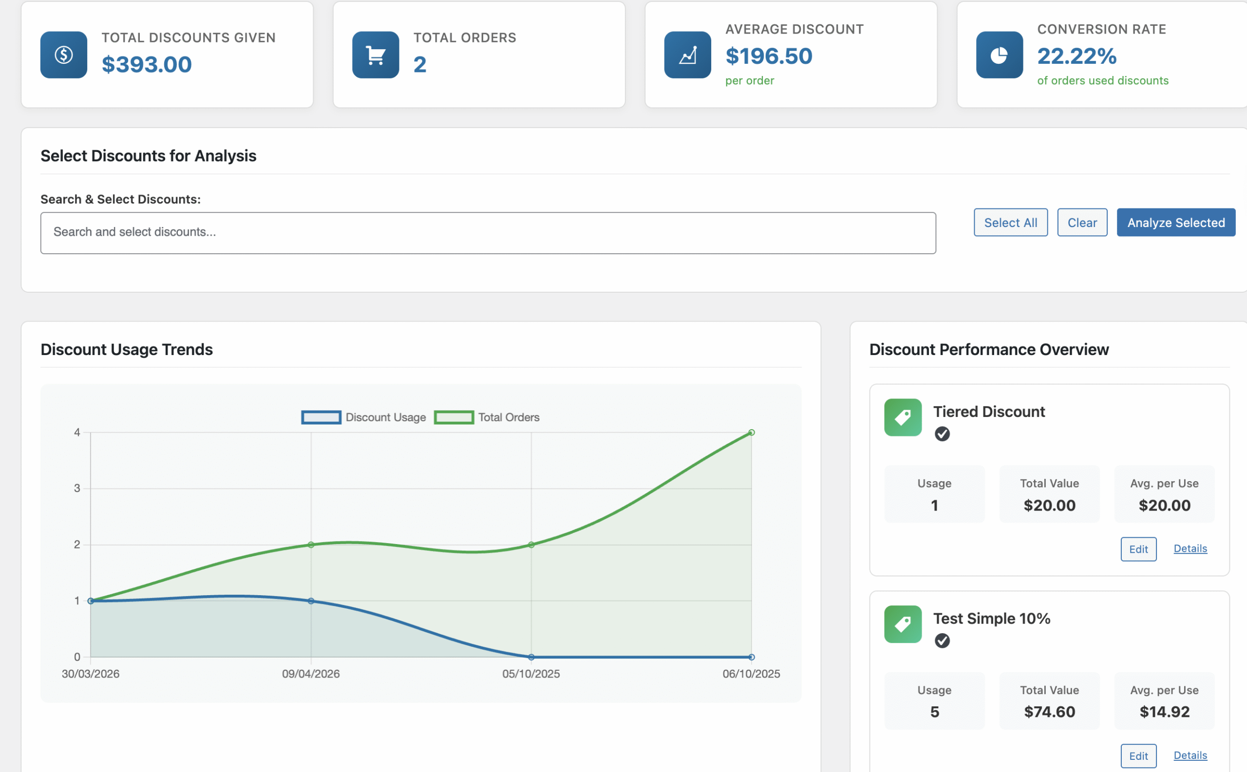 Yes. Built-in analytics allows you to track discount performance, revenue impact, and usage trends.